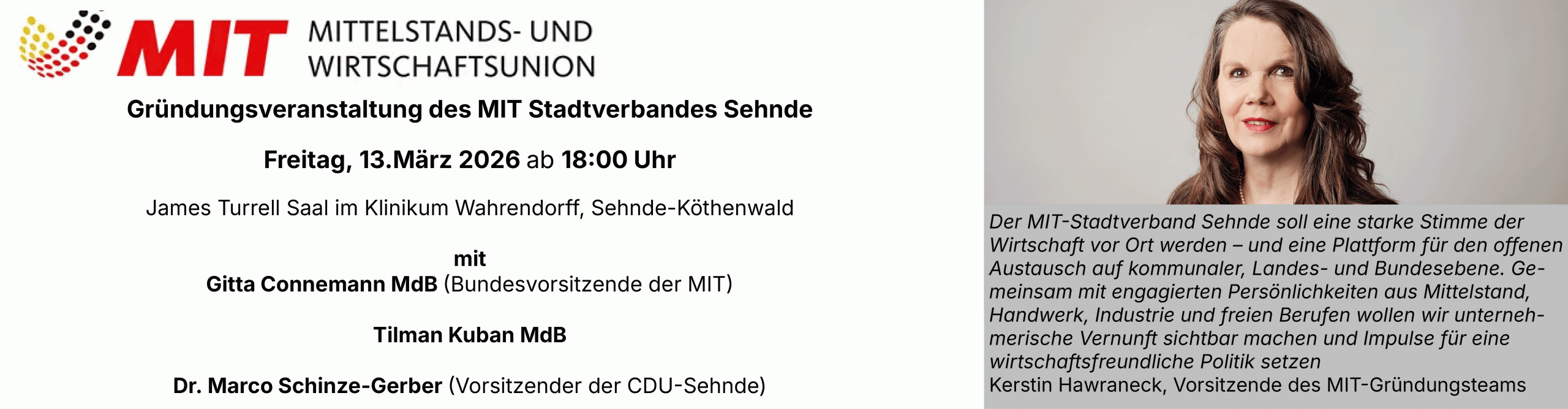Starke Stimme für die Wirtschaft vor Ort – Mittelstands- und Wirtschaftsunion (MIT) gründet Stadtverband in Sehnde – Gitta Connemann als Ehrengast erwartet